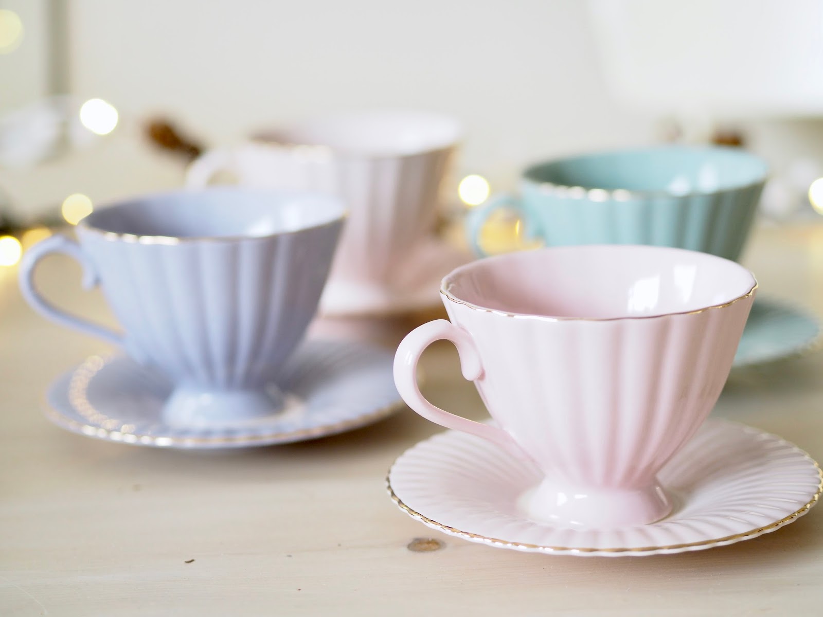 The teacups come in a set of four in a gorgeous gift box, they come with a plate and saucer and come in four different pastel shades and match the plates nicely too.
