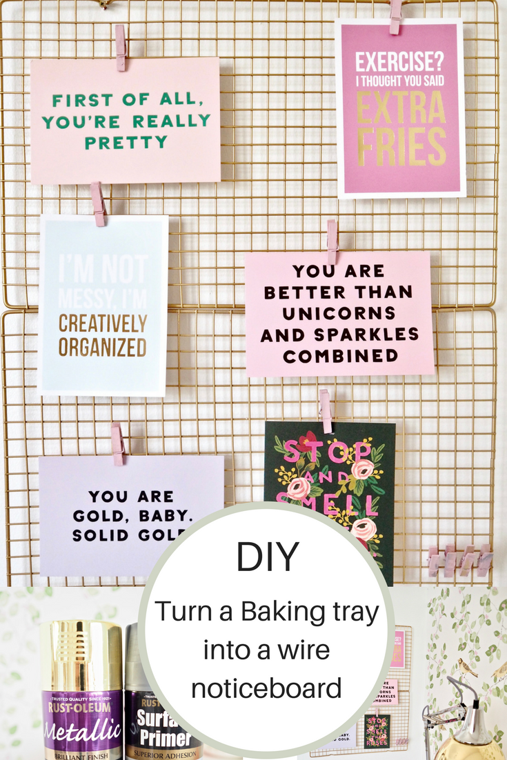 Today I have a really fun DIY, it is so simple to do that anyone can try it. I was recently at a filming of Showhouse Showdown and in one of the office rooms, there was a gorgeous wire noticeboard with quotes clipped on it. I wondered where they got it from but when I googled I stumbled across a DIY on Pinterest where they sprayed some wire baking trays and hung them as noticeboards. So, I decided to give it a go myself.