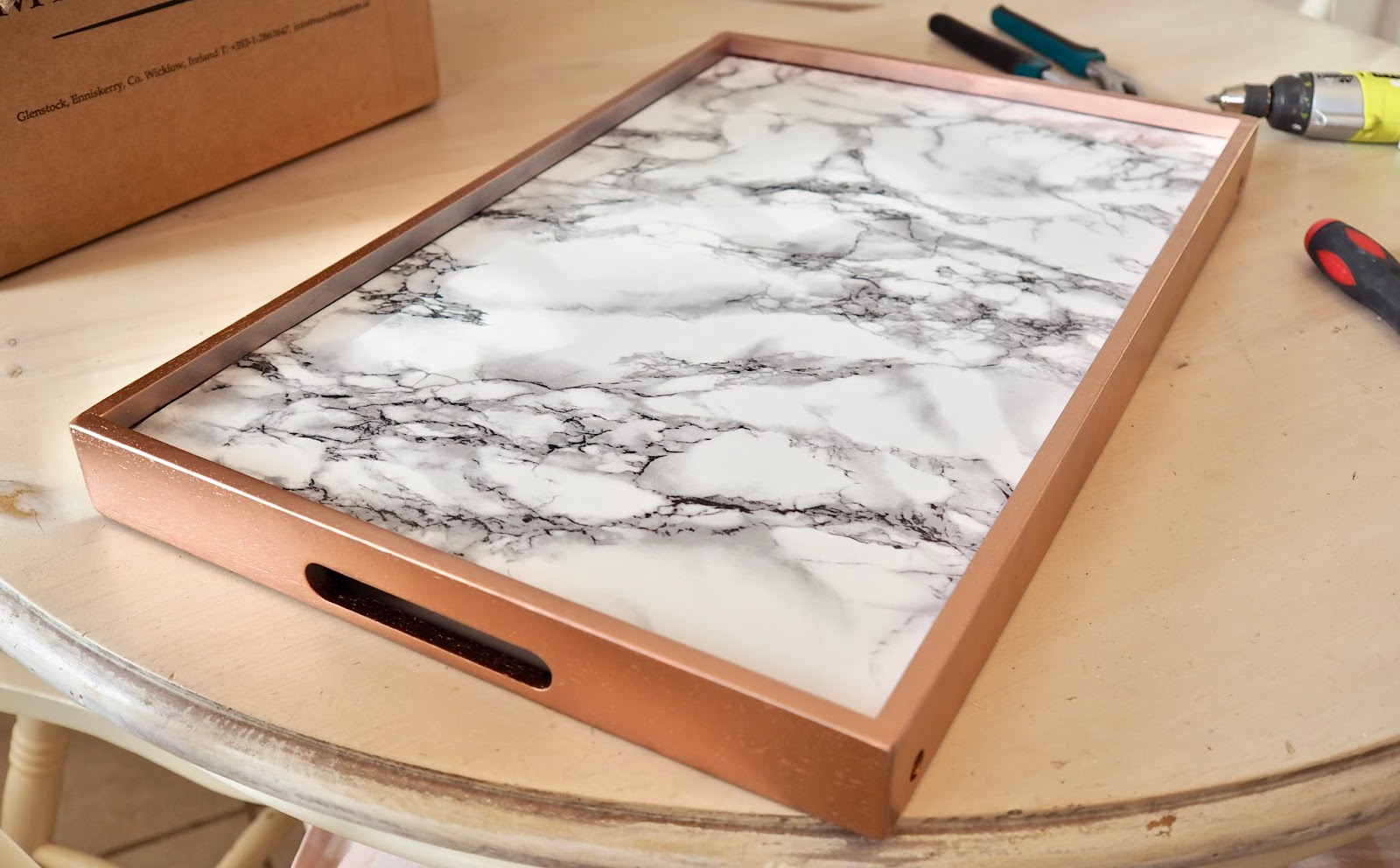 So, remember when you were younger and your Mam would make you cover your school books with that sticky wrapping paper to protect them. Well, contact paper is kind of like that, however, it has definitely improved over the years. It is like a sticky wrapping paper and you can use it to cover almost any surface. I know people who have used it to cover appliances, fridges and even their kitchen cabinets. I got my marble effect contact paper from my local Woodies, I got a large roll for €6.99 however, they did have a smaller roll for €4.99 which would have been plenty for today’s project.