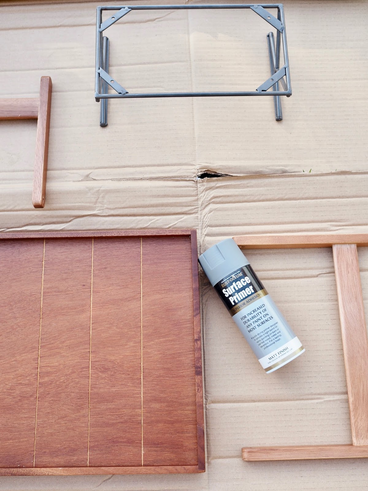 You might remember my Copper Spray paint DIY from earlier this year. I got the spray paint back out of my kit and used it again for this DIY. Just like in the last DIY, I used the surface primer with the copper paint. To get a professional finish, I unscrewed and removed the legs of both tables and sprayed them with one coat of surface primer. Once fully dry, I then applied one coat of the copper spray paint. One coat was enough and it gave great coverage. Make sure to follow the instructions on the back of the can and always follow the safety instructions and use it outside and wear protective gloves. I got my spray paint from Woodies also and you can check the Rustoleum website for stockists near you.