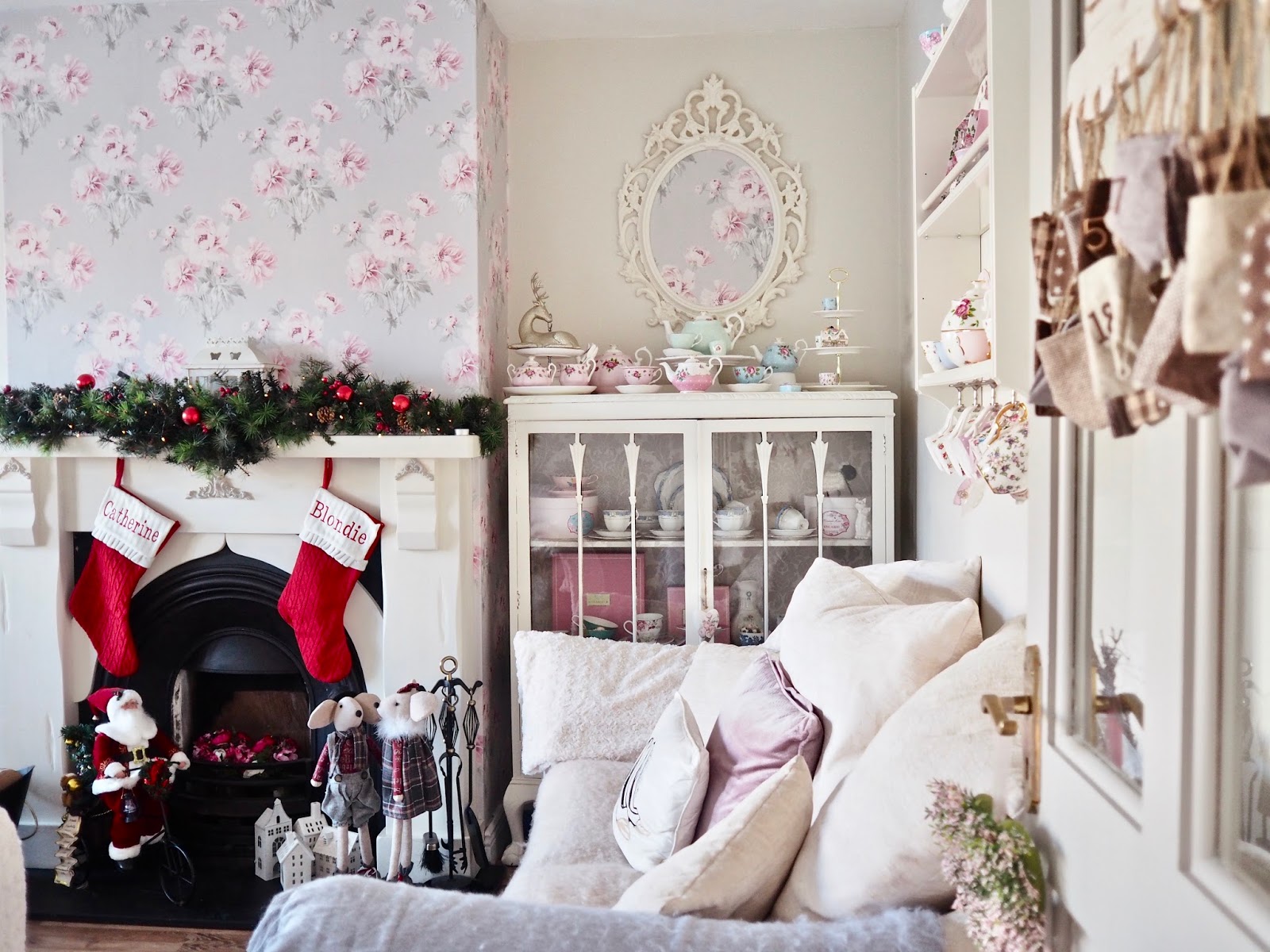 I try and have a little bit of Christmas decor in each room. In the kitchen, I have some garlands going across the top of my kitchen cabinets. I have dressed the shelf with some Christmas ornaments too which you can see in my Youtube video.