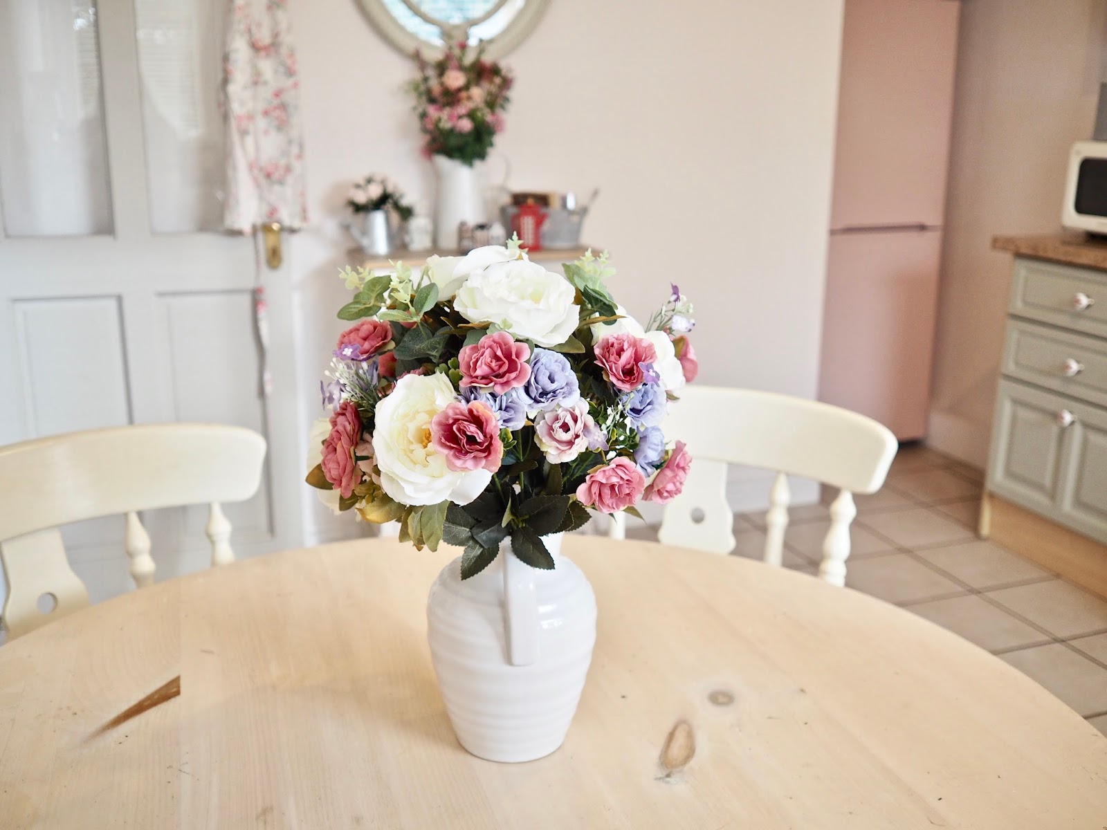 Those of you who have watched any of my room tours on Youtube will know that I am a bit of a faux flower lover. As my house lacks natural sunlight I find real flowers can die easily in the house. I tend to keep a real bunch of flowers in the kitchen and then in the other rooms, I love to use faux flowers to add some colour to the room. I treated myself to two new sets of flowers from Dunnes Stores. The first set in the picture above was €40 ( although I did use my Mam’s staff discount which made it cheaper ), These also come in a really pretty white vase.