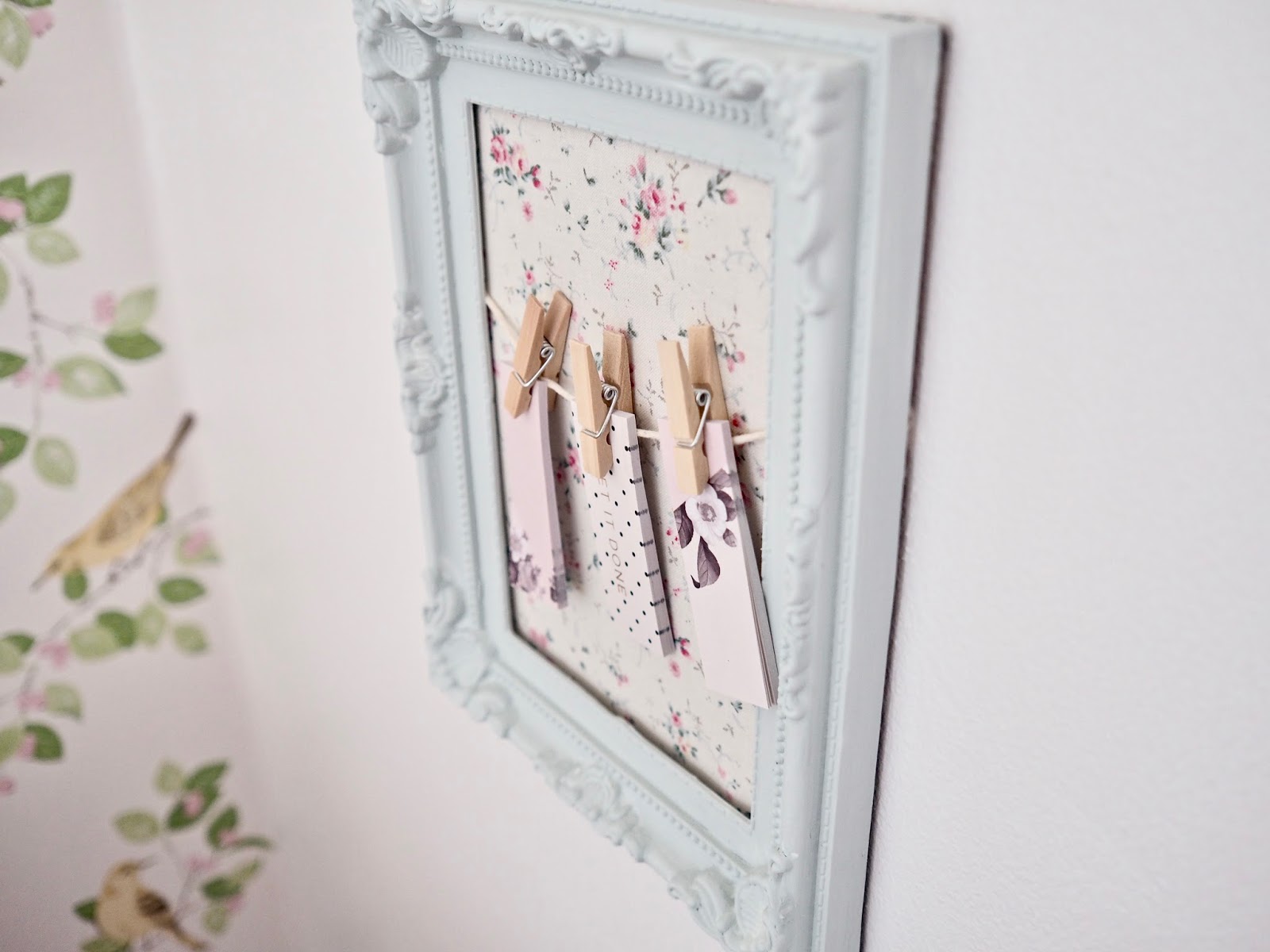 I picked up this ornate plastic frames from Dealz. It had been sitting in my craft stash for ages. I decided to turn them into a mini noticeboard to sit alongside the other ones I had made. I gave them two coats of Autentico chalk paint in the shade Rose and Copenhagen Green. I then lightly distressed and sealed it with some wax. I applied the fabric to the backing of the frame using some glue. Making sure it was pulled tight. You can use some twine and pegs as well to hang your to-do lists off.