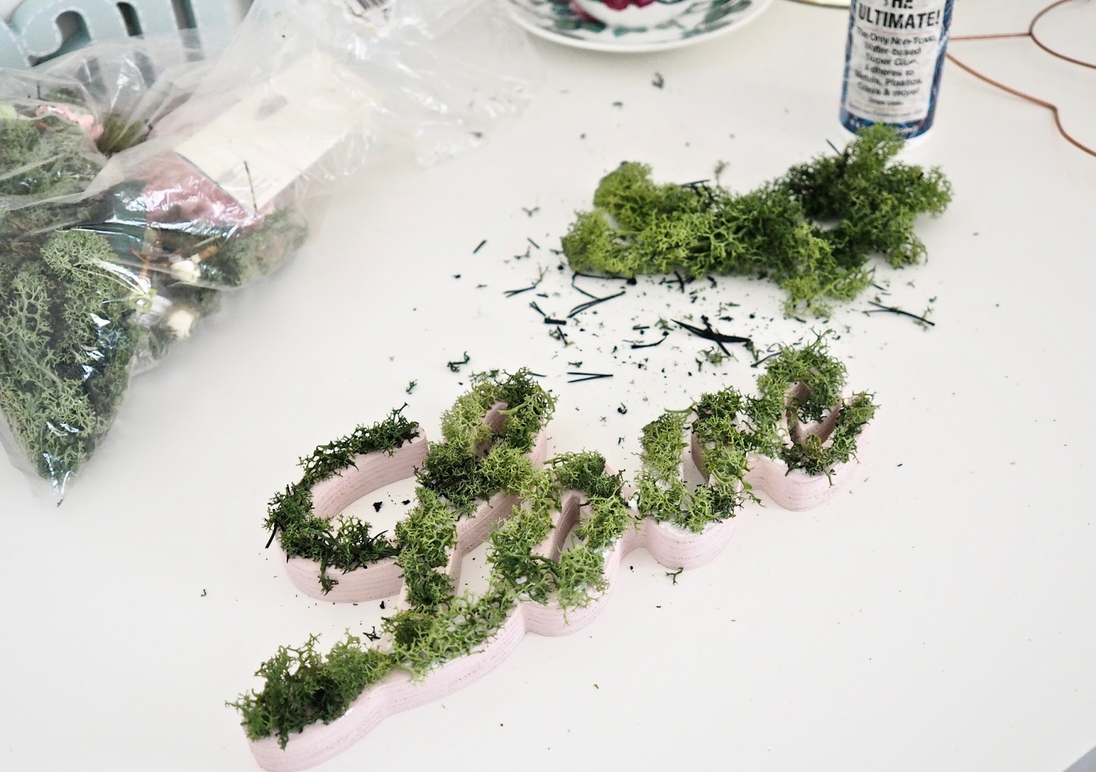 I first gave the letter a coat of paint, I had a tester size pot of Autentico chalk paint in the shade rose. I gave the love sign one coat of the rose paint. I let this fully dry before glueing on the moss. Once I was happy with how much moss I had put on the sign I then added on the mini roses. I used three packets of mini craft roses on this sign.