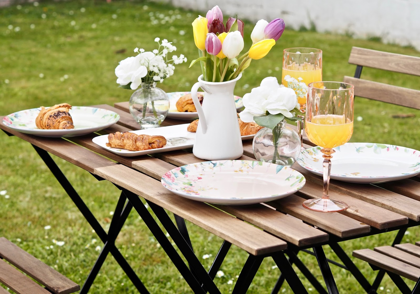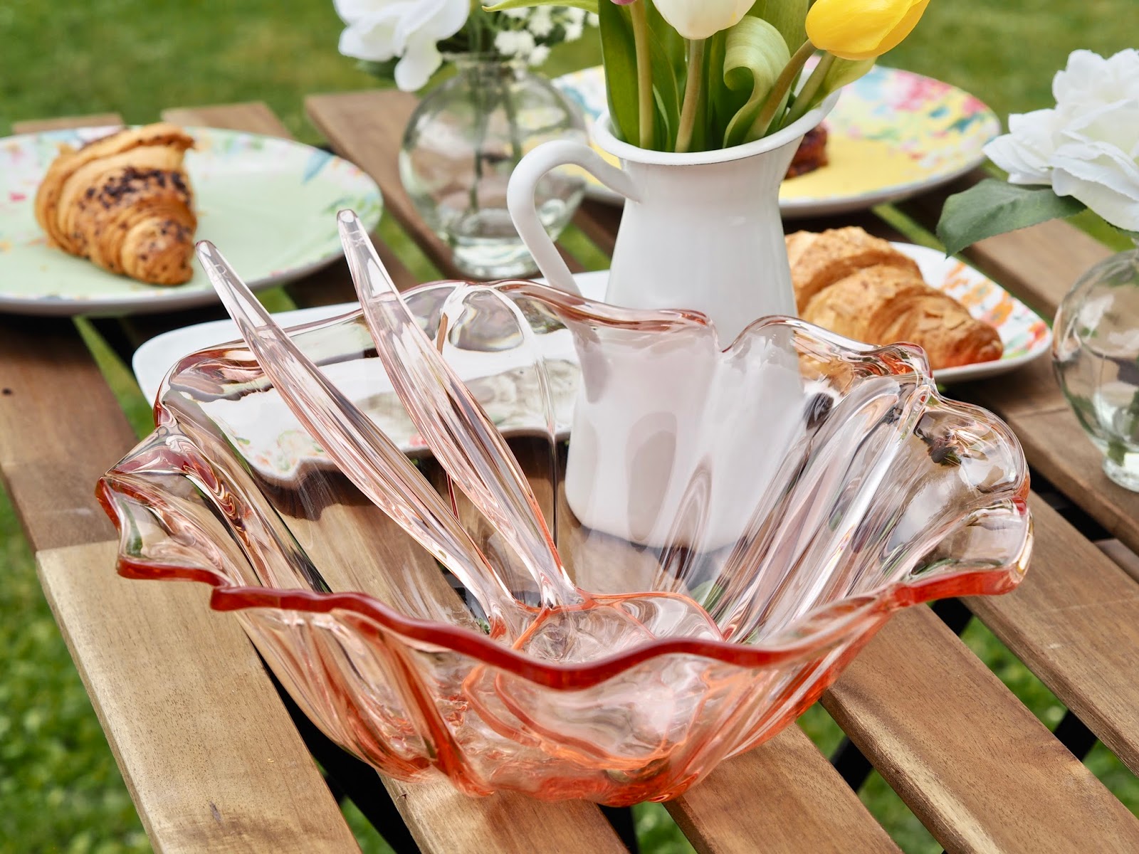 When it comes to styling your table you can have fun and you can show off your culinary skills ( or if you’re like me your lack of culinary skills). I picked some pieces from the garden shop on the Laura Ashley website to style my table. For my glasses, I picked these blush acrylic glasses. How perfect for serving up your bottomless mimosas or bellinis. They come in different shapes and sizes and you can get them in tumbler styles or champagne flutes too.