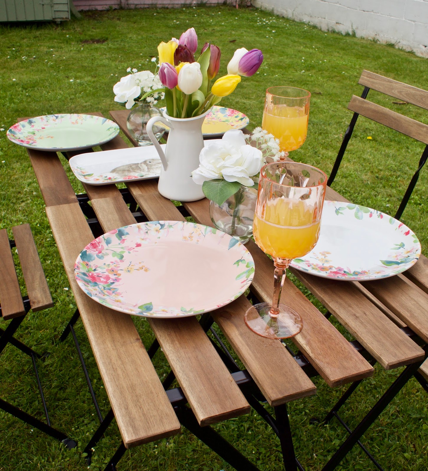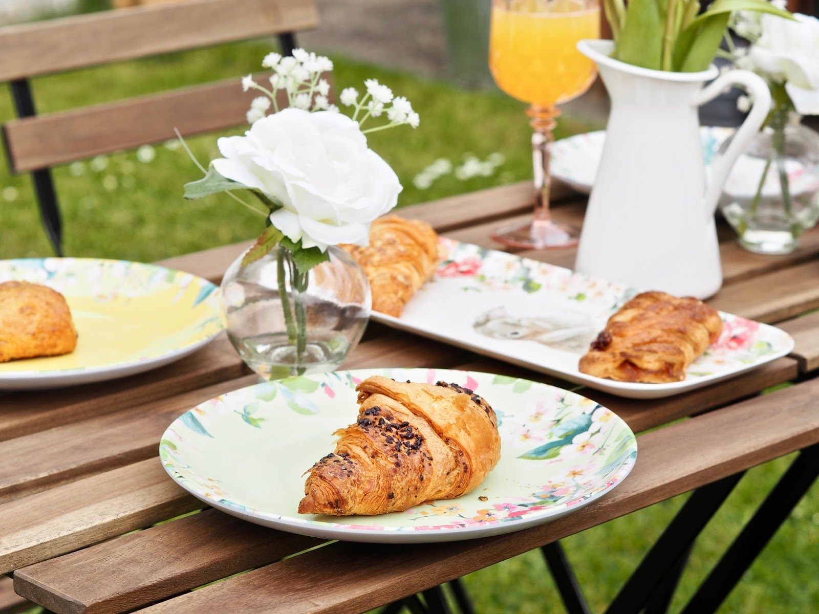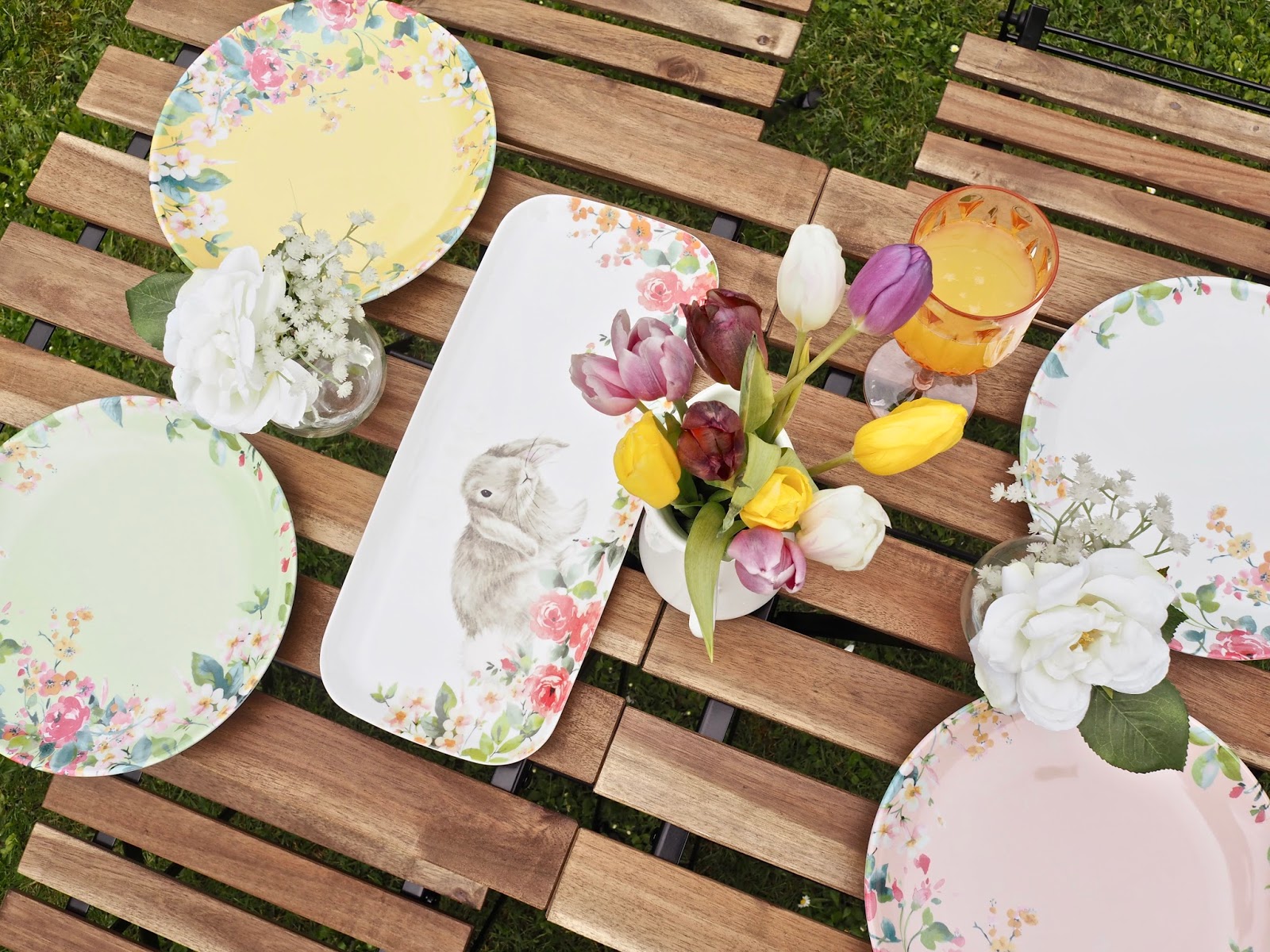 What better way to show off your perfectly poached eggs than on these cute floral plates. They come in a set of four and they were larger than expected which was great. Just like the glasses these are also lightweight and made from a plastic style material making these perfect for packing into a picnic basket. I used the adorable rabbit print tray to serve some pastries and jam off. I just thought the rabbit print was perfect in the garden.