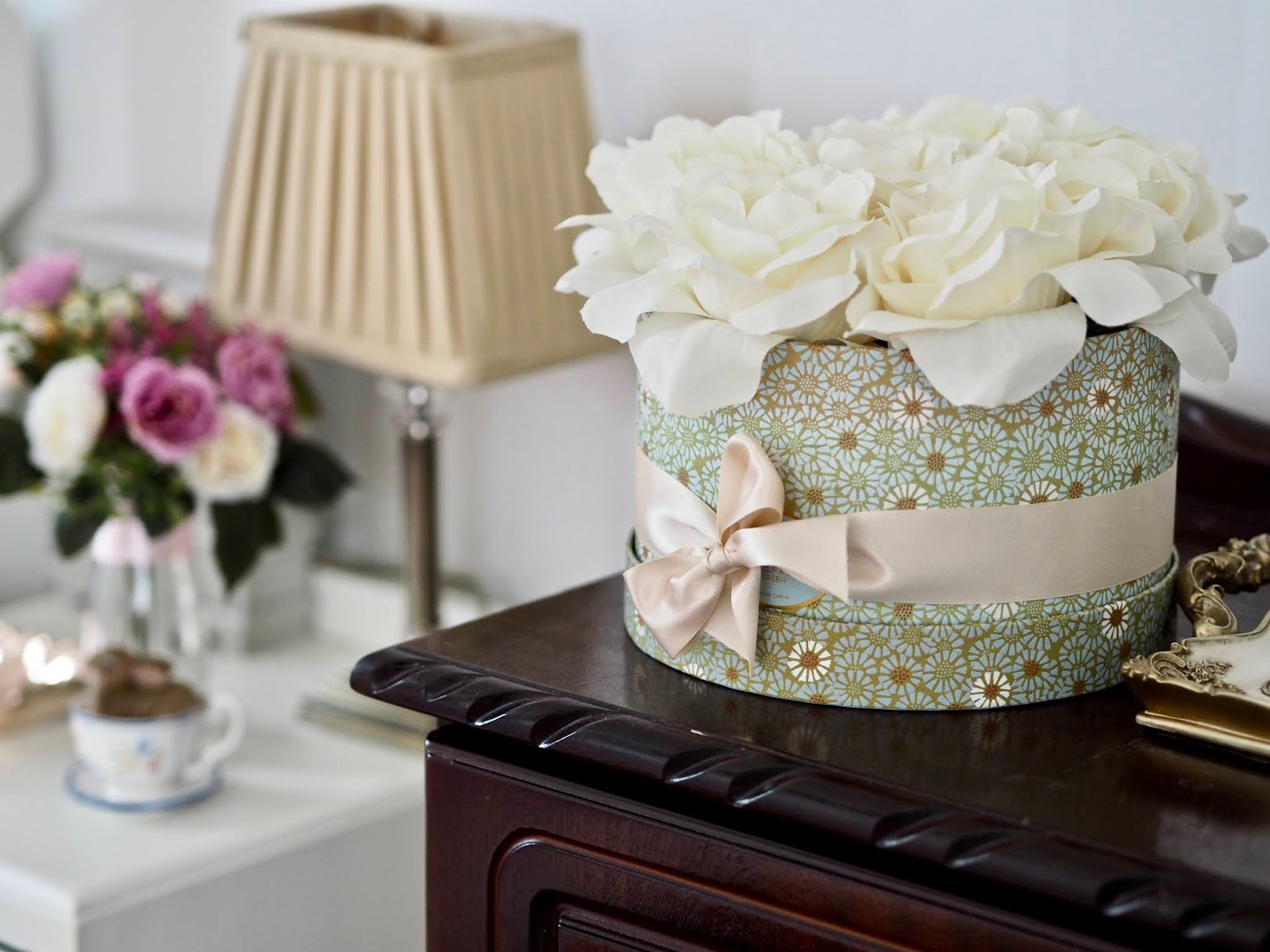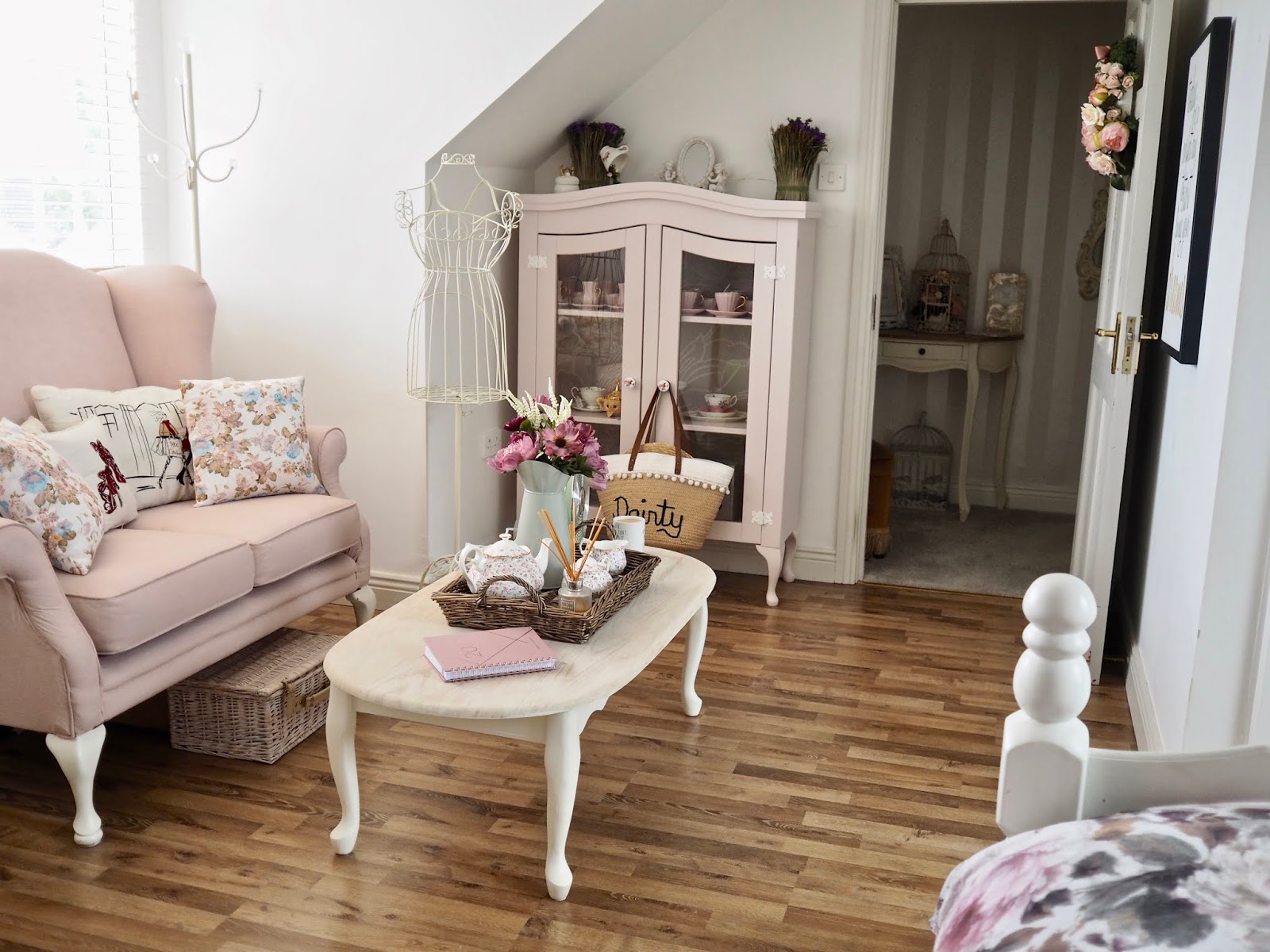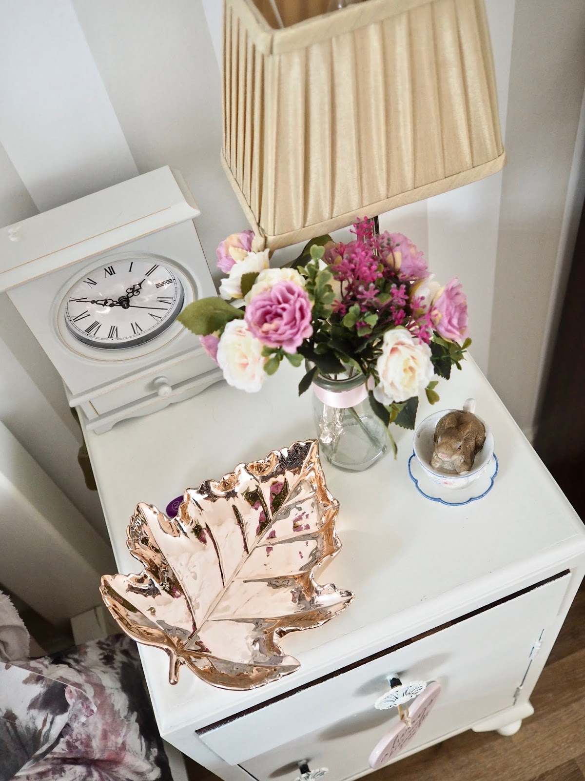 When it comes to the paint and wallpaper I kept everything bright and reflective to make the room look bigger and brighter. The wallpaper I have in the room is the Lile wallpaper by Laura Ashley and I also have the walls painted in cotton by Laura Ashley. This makes the room nice and bright and I also have some of the Lile stripe wallpaper in the hallway. By keeping the walls neutral I can play around with colour through my accessories. Whenever I get bored I can easily change my bedding and trinkets and it gives the room a new feel. The bedding I am using at the moment is from Christy.co.uk.