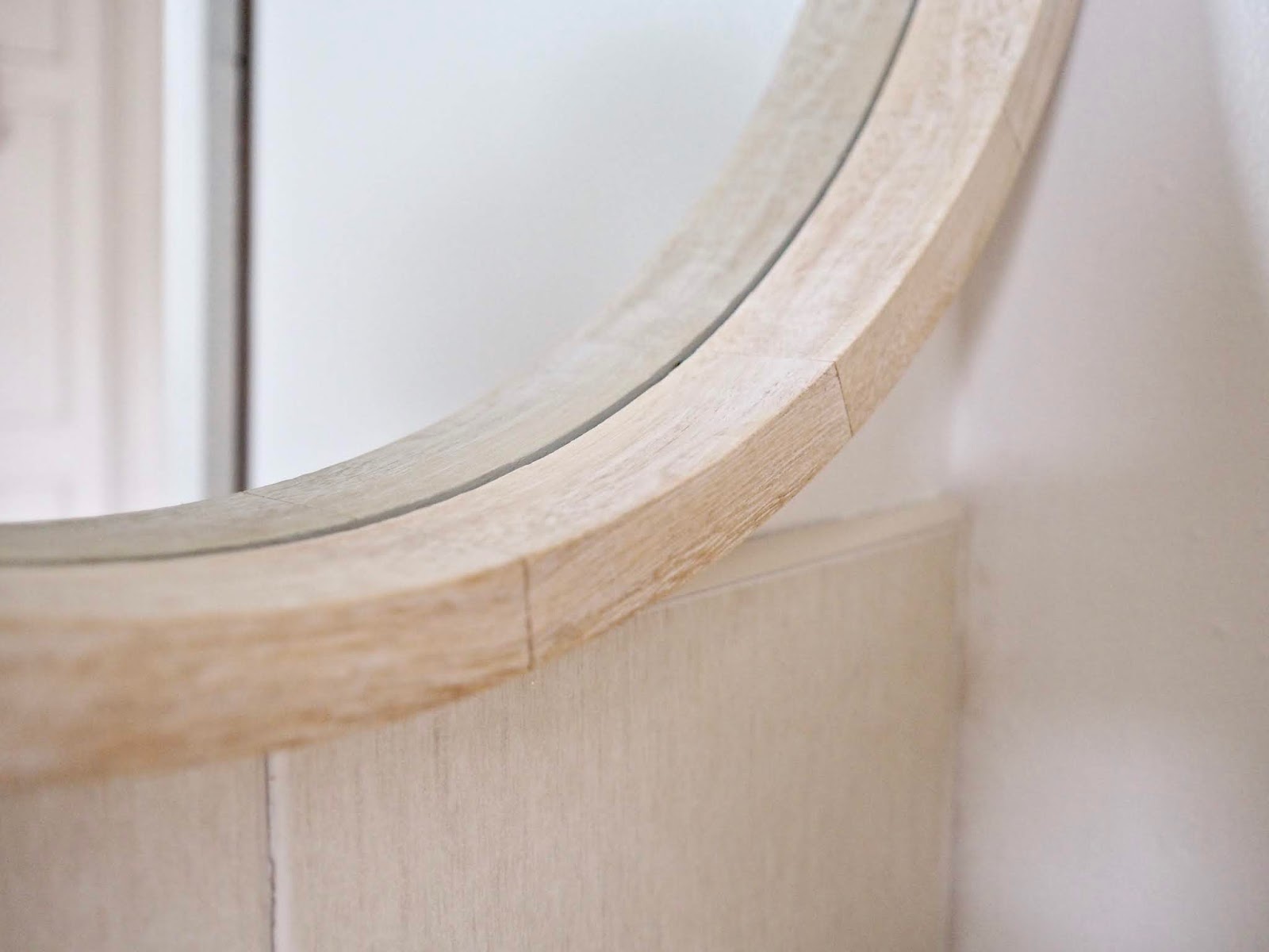 If you have a small room that you want to make look bigger then a little trick is to add some mirrors. I picked up this round mirror from The Range. The wood on this mirror complemented the colour of my tiles. Round mirrors are also on trend at the moment. If you are wondering why my mirror seems so low this is because I am only 4ft 11 and I need to be able to see into it lol. The small narrow cabinet that is in the room is from Argos. I bought this when I first moved in but you should be able to get a similar one.