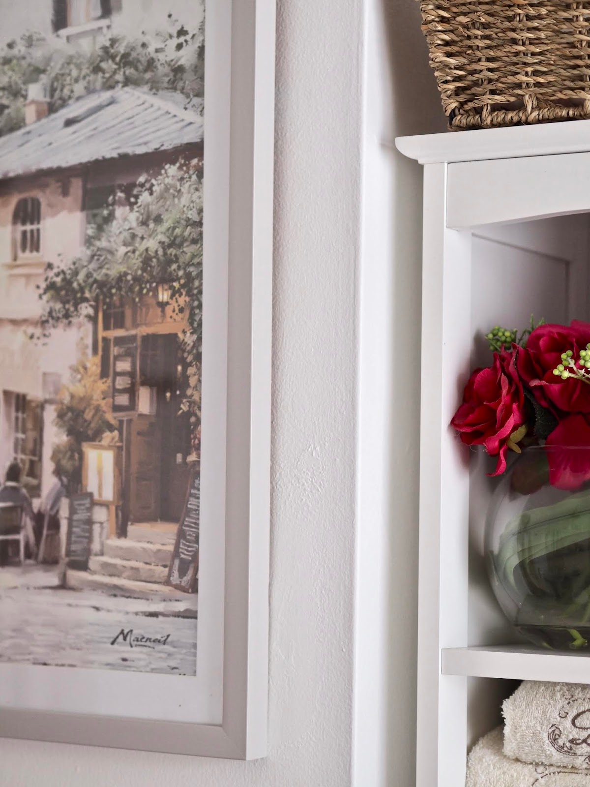 I decorated my shelves with some of the trinkets that I brought from Ikea and Homesense. You can check out my last homeware haul video to see what I picked up. I used colours that complimented the colours in the room. My colour palette is mainly whites with pops of sage green and light pink. I also added a painting to one of the bare walls. I loved this painting because it reminded me of my recent trip to Provence.