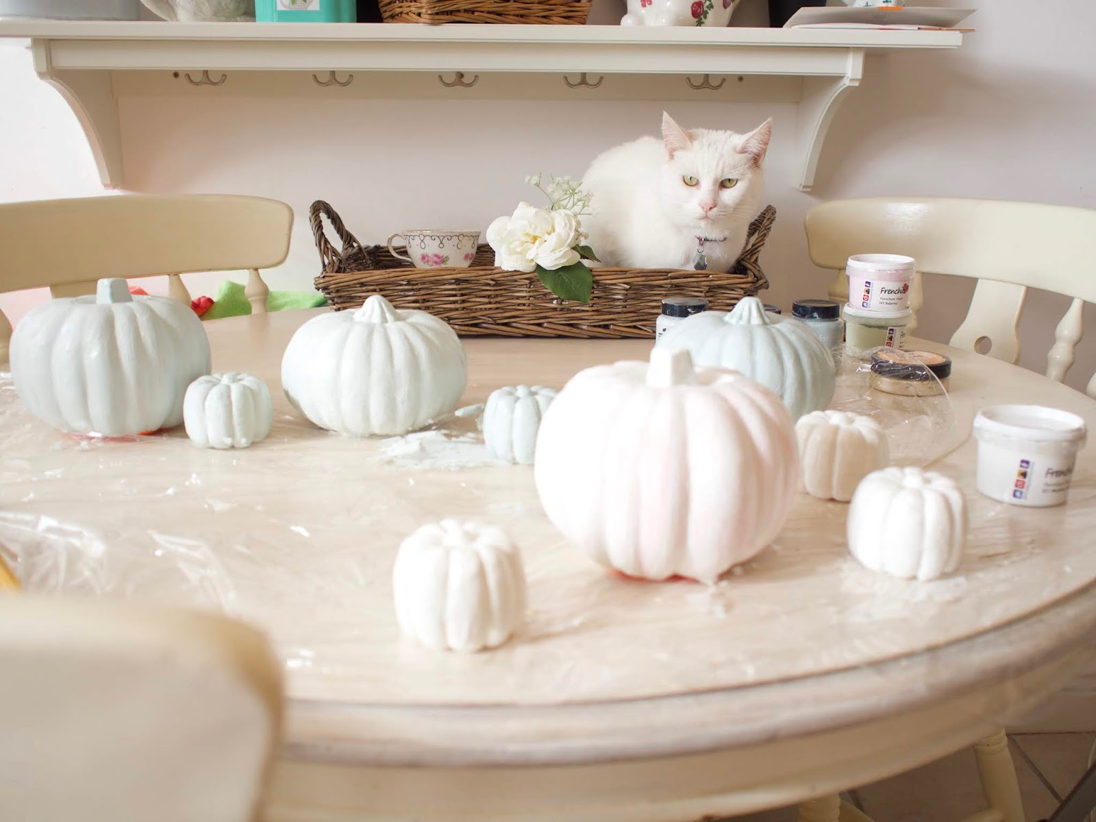 I used some chalk paint that I had lying around in my crafting kit to paint my pumpkins. As chalk paint sticks to most surfaces, I decided to use it on the polystyrene. I recommend getting some small tester pots as there is plenty of paint in these pots for your project. You can get really creative and pick colours that compliment each other. I went for different shades of green and cream as these are the colours in my home. You could also spray paint your pumpkins. You might have seen my leaf trinket dish DIY from last week, I used some bright copper spray paint on them and that spray paint would also be fab for this project. If you want you can add some wax or varnish to seal the chalk paint on your pumpkins. I wanted mine to have a slight sheen so I sealed them with some clear satin varnish.