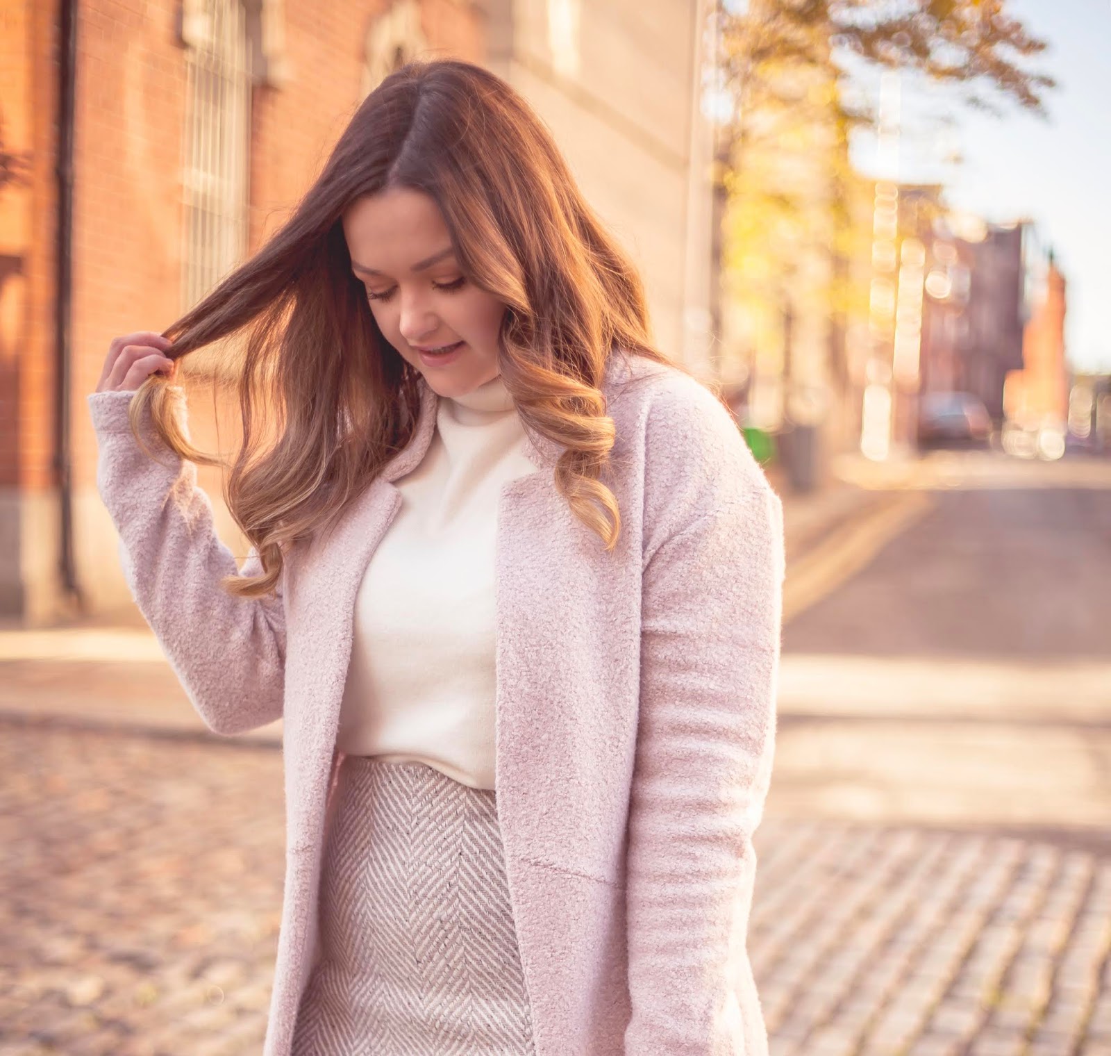 I like to brighten my wardrobe with some lighter tones as I am not a fan of the dark Winter days. I choose this wool skirt as I like the heavier texture and I teamed it with a roll neck jumper and layered it with this pink coat. This pink coat is a steal at €49, it’s actually lighter than a coat but heavier than a cardigan making it easy to layer. I teamed it with these square-toed Chelsea boots. I have been wearing the ankle boots from my previous m&s posts and I have to say they are so comfy for work. I recently wore these boots in London for the day and they were so comfy.