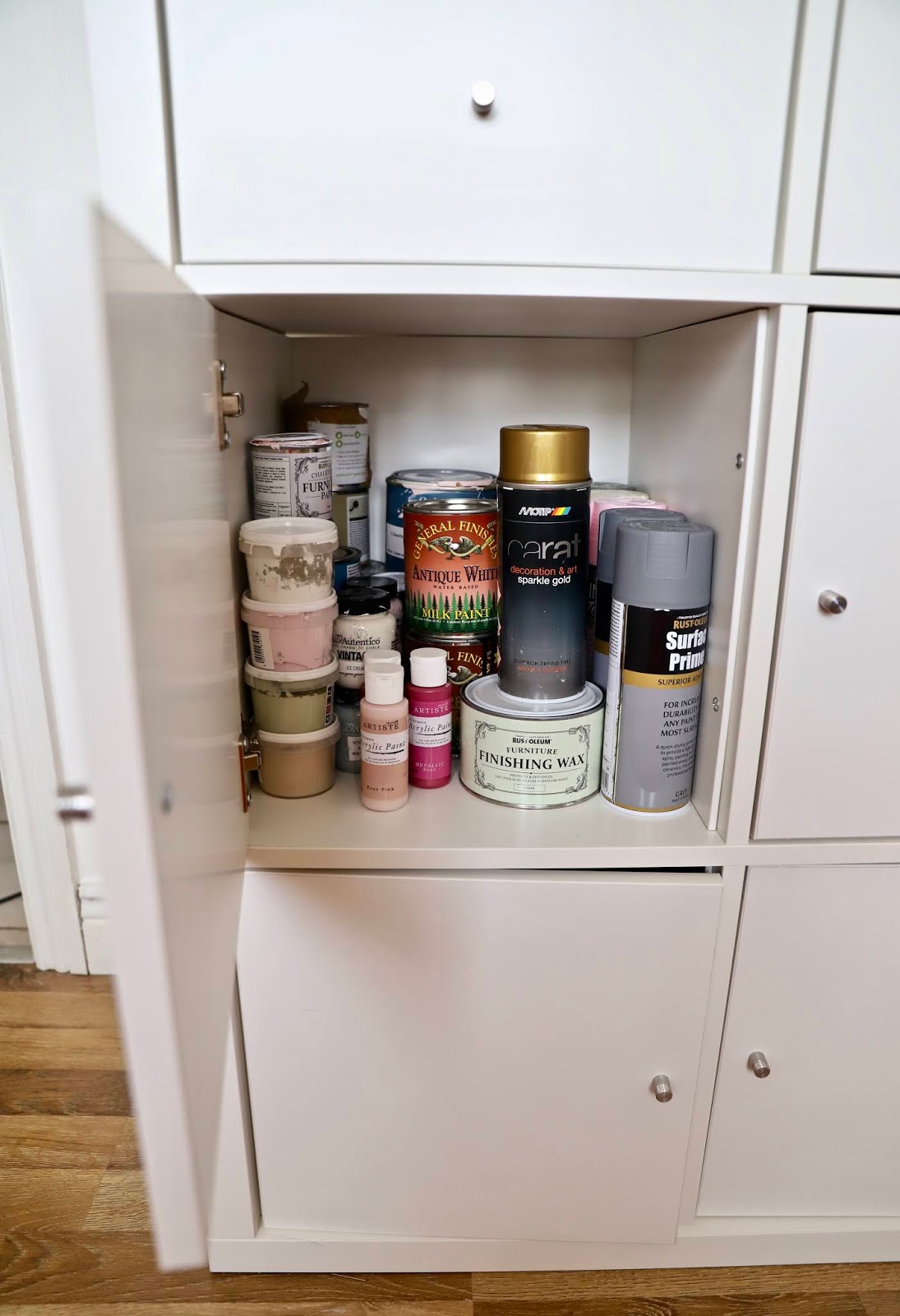 I organised all of my different crafts together. So, I grouped all of my sewing items together and I organised them into my wardrobe. I then grouped together my tools and paints and I gave them their own space. I put items of similar size together. The drawers of the Kallax unit made it easy to store the like of my smaller tools and smaller photography items. I found I didn’t have to throw out too many items as once I organised my space better I had the room to store my items.