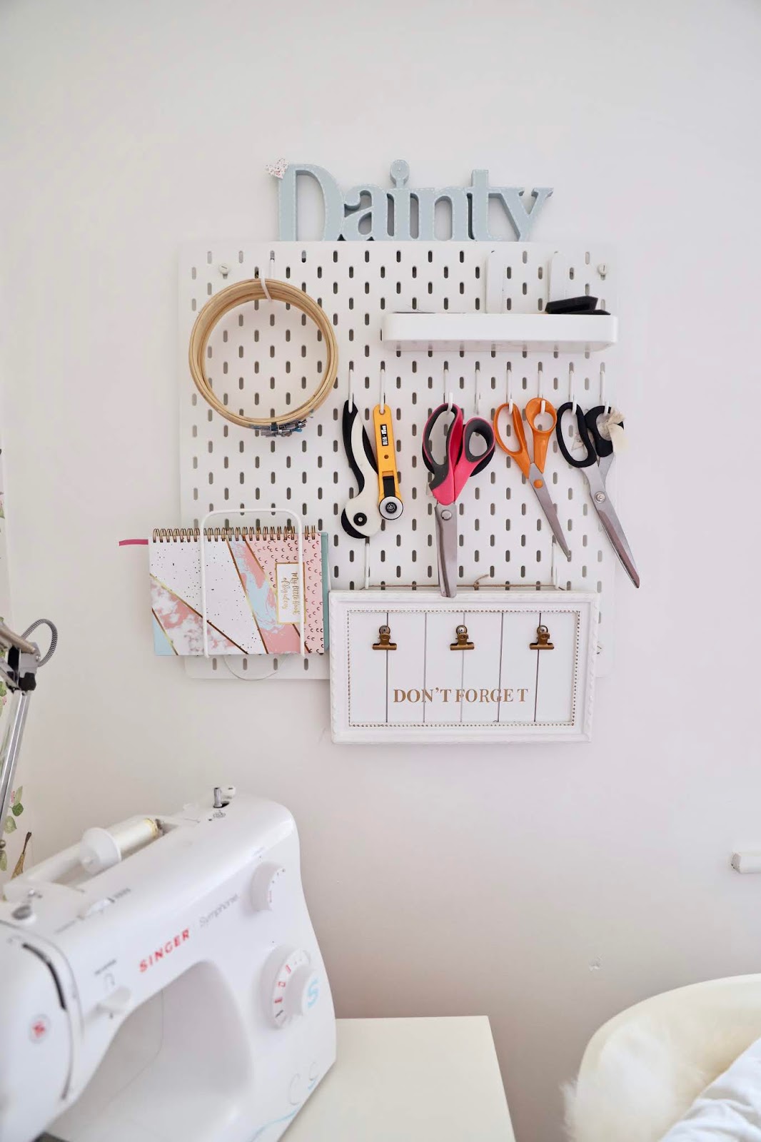 I also added the Ikea pegboard to my workspace. I used the different hooks available to add the items that I needed the most. I have my fabric scissors on here as well as some of my paint brushes. I drilled my pegboard to my wall but I did notice there was a wall hanging kit in Ikea, so, if you are a renter and cannot drill then check out that kit.