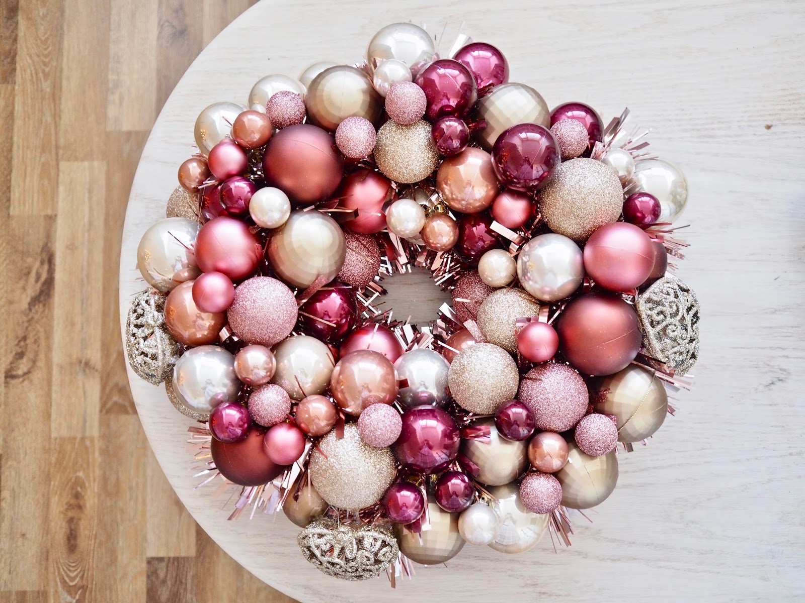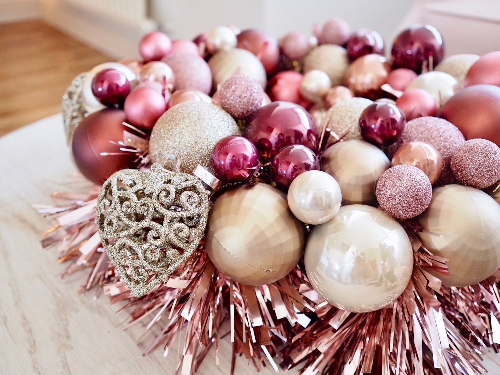 Today I have a really fun Christmas DIY. It is so simple that anyone can try it. It was actually my first time to attempt to make a DIY bauble wreath and I am really pleased with how it turned out. It is a great way of reusing old baubles that you have from previous years. This year I got some new baubles, I didn’t want to throw them out, so, I had a look on Pinterest for some ideas. I came across loads of people trying DIY bauble wreaths so I decided to give it a go. I reused some old baubles but I also bought some cheap ones from Primark to add to the wreath. I wanted a rose gold themed wreath so I bought some baubles in a copper/rose gold colour to add more colour to my wreath.