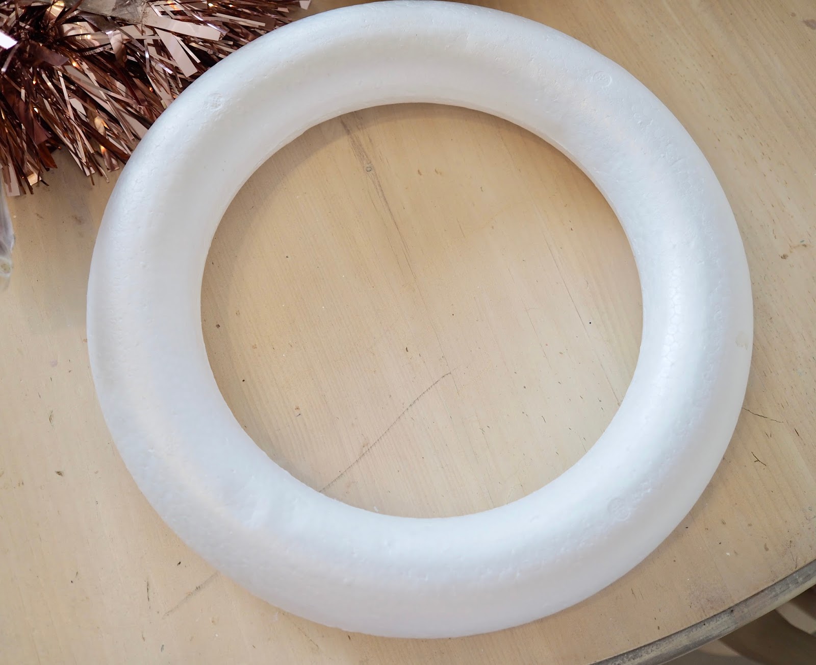 All you need for this DIY is a polystyrene ring, glue, tinsel and baubles! Oh and some patience! lol, This Diy only took me an hour to make so it is a fun afternoon DIY. I put together a Youtube video of this DIY to give you a better idea as to how I made it. It is really simple. I picked up a polystyrene ring from Mr Price for €2.99, you can also get these in the craft shops.