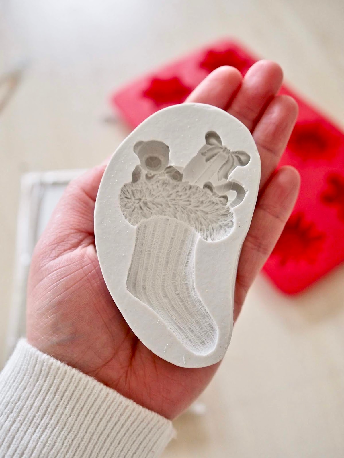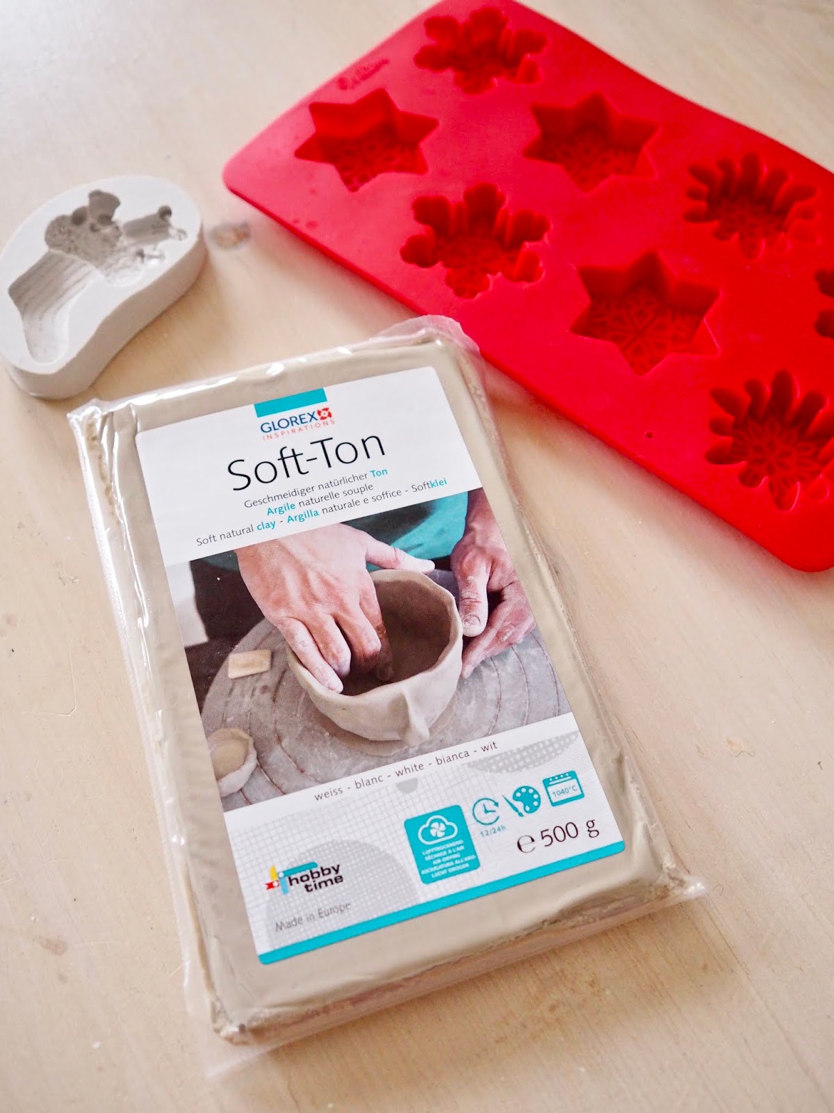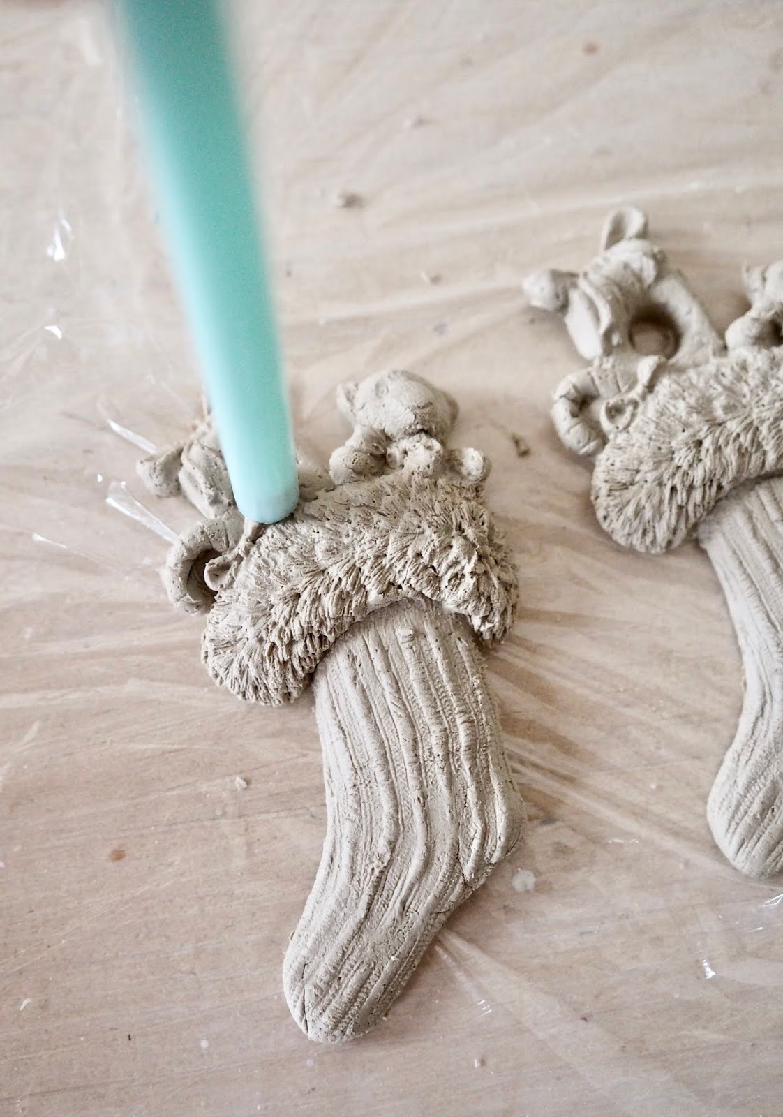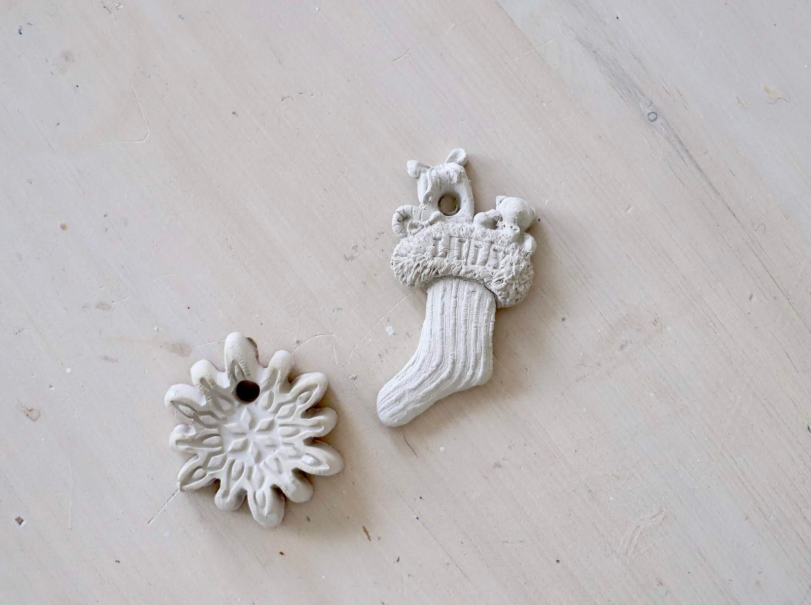 I warmed up some air dry clay in the palms of my hands. I then used my Christmas shaped moulds and I pushed the clay into the mould. I then gently peeled out the clay and I was left with my Christmas shaped clay ornaments. I then used a straw to add a perfectly round hole. I will use this hole to add my string so I can hang them on my tree. I used a stamping kit that I got in Sostrene Grene to add my Niece and Nephew’s name to the clay.